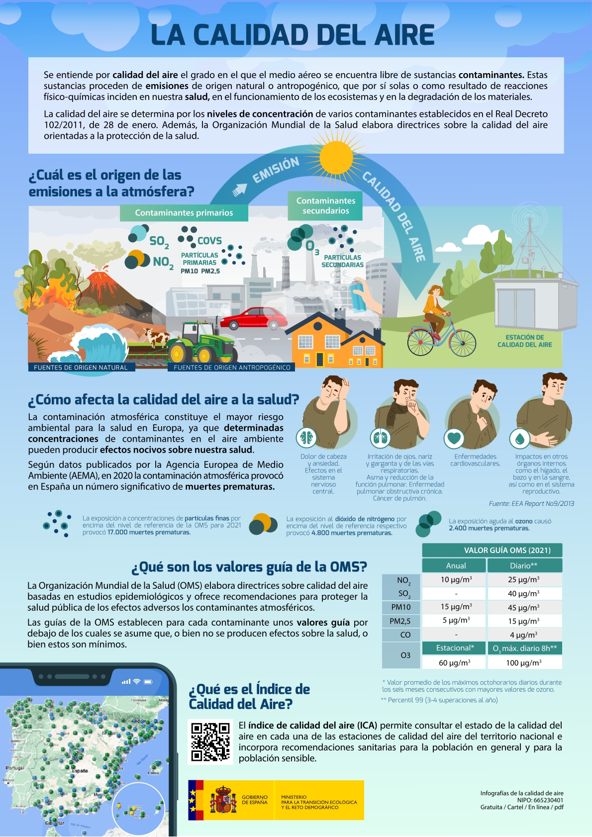 El documento La calidad del aire explica el concepto de calidad del aire como el grado en que el medio atmosférico se encuentra libre de sustancias contaminantes procedentes de fuentes naturales o antropogénicas, que pueden afectar a la salud, a los ecosistemas y a los materiales. La publicación describe los principales contaminantes atmosféricos y señala que la calidad del aire se determina a partir de las concentraciones medidas conforme a los criterios establecidos en el Real Decreto 102/2011 y a las directrices de la Organización Mundial de la Salud. El documento expone el origen de las emisiones, diferenciando entre fuentes naturales y fuentes antropogénicas, así como entre contaminantes primarios y secundarios generados por reacciones físico-químicas en la atmósfera. También analiza los efectos de la contaminación atmosférica sobre la salud, indicando que la exposición a partículas finas, dióxido de nitrógeno u ozono puede provocar enfermedades respiratorias, cardiovasculares y muertes prematuras. La publicación incluye los valores guía recomendados por la OMS para distintos contaminantes y explica el índice de calidad del aire como herramienta para informar a la población sobre el estado del aire en cada estación de medición. Asimismo, se señala que la contaminación atmosférica constituye uno de los principales riesgos ambientales para la salud en Europa y que su seguimiento se realiza mediante redes de control distribuidas por el territorio.