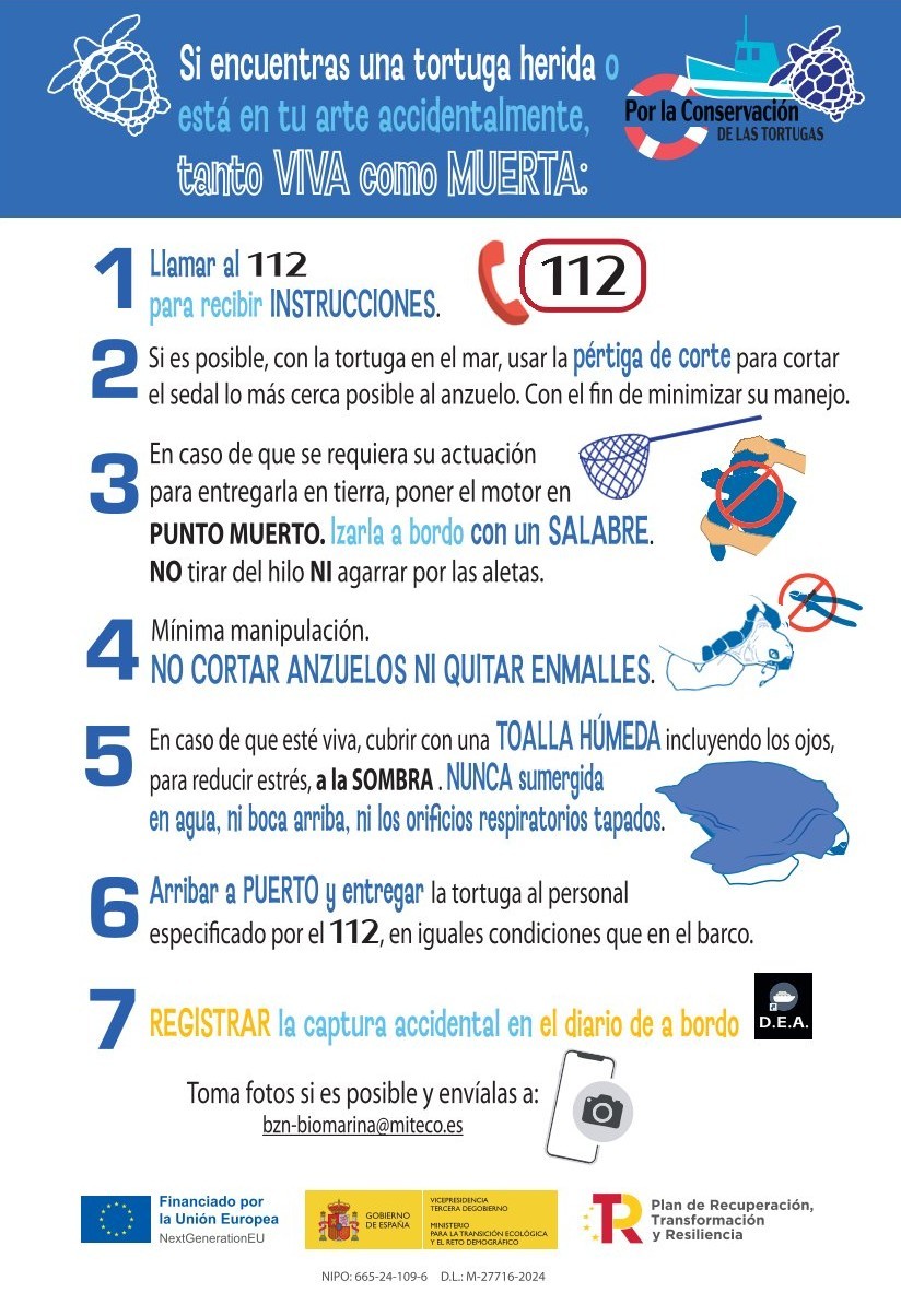 El contenido es una guía de procedimientos sobre cómo actuar en caso de encontrar animales marinos heridos o atrapados en artes de pesca, incluyendo tortugas, aves y cetáceos.